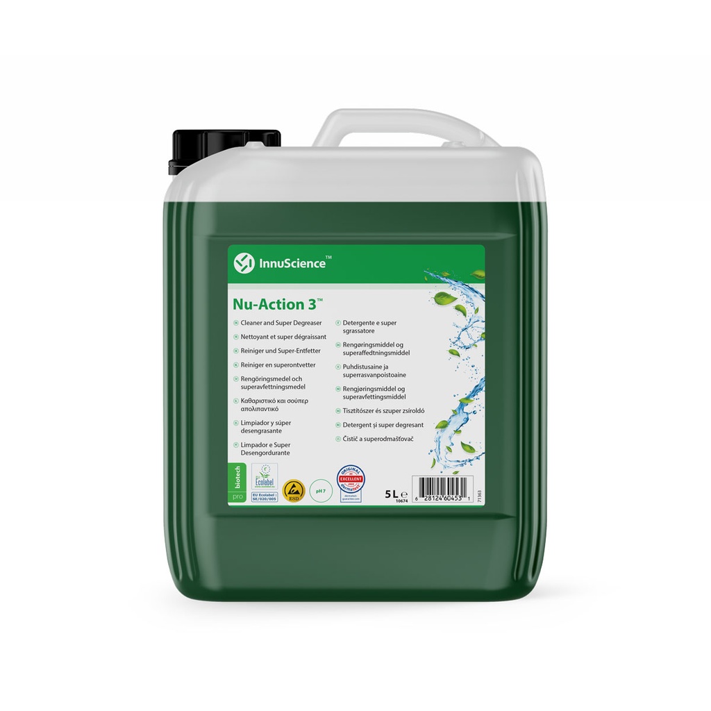 Nu-Action 3 é um super desengordurante biotecnologicamente concebido pela Innuscience para remover manchas difíceis, limpar e desengordurar rapidamente e completamente todas as superfícies.